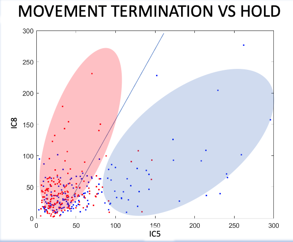 Experimental protocol and signal-processing pipeline to classify movement termination based on EEG and EMG data for BCI application. In this paper it is described a blind source separation method integrated with wavelet discrete trasform to extract beta band hypersynchronization related to movement termination in healthy patient. EEG-feedback reinforcement learning based therapy rarely address improvement in grip termination. This preliminary study tries to justify the use of this approach in future experiments on stroke patients where BCI therapy has shown to improve latency of grip initiation and torque exerted. Electroencephalogram (EEG)-based brain-computer interface (BCI) allows individuals to elicit cortical activity and control external devices by merely thinking about the desired movement, this is achieved by recording electric signal over the sensorimotor areas and detecting EEG power changes known as Event-Related Desynchronization and Synchronization (ERD/ERS) in movement-related mu (8–12 Hz) and beta (18–26 Hz) rhythms. Through SMRs, researchers have found a way to decode motor intention, and to train individuals to increase or decrease SMR activity through motor imagery or mental intention (Buch et al., 2008; Ramos-Murguialday et al., 2013;Yuan & He, 2014; McFarland et al. 2015). In particular, this type of rhythm shows recurrent patterns in movement initiation and termination which can be measured as an abrupt change in the power spectra of the signal a few milliseconds before the actual movement called event related desynchronization (ERD). ICA is a statistical strategy for maximizing the independence of observable data by finding linear projections. When used in Blind Source Separation (BSS), ICA seeks to recover distinct sources from mixes of those sources utilizing multi-channel data. EEG, electrocardiogram (ECG), magnetoencephalogram (MEG), and functional magnetic resonance imaging (fMRI) signals have all been successfully processed using ICA over the last two decades. ICA has demonstrated a good ability to separate scalp EEG signals into functionally distinct sources, such as neuronal components emanating from different brain areas and artifactual components related to eye movements, blinks, muscle, heart, and line noise in EEG signal processing. ICA has been effectively utilized to various applications because to its supremacy in EEG source separation such as signal-to-noise ratio (SNR) enhancement of task-related EEG signals, and EEG source localization. Numerous studies using EEG-based BCI have used ICA to increase task-related EEG signals and optimize electrode locations.