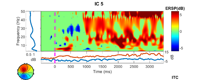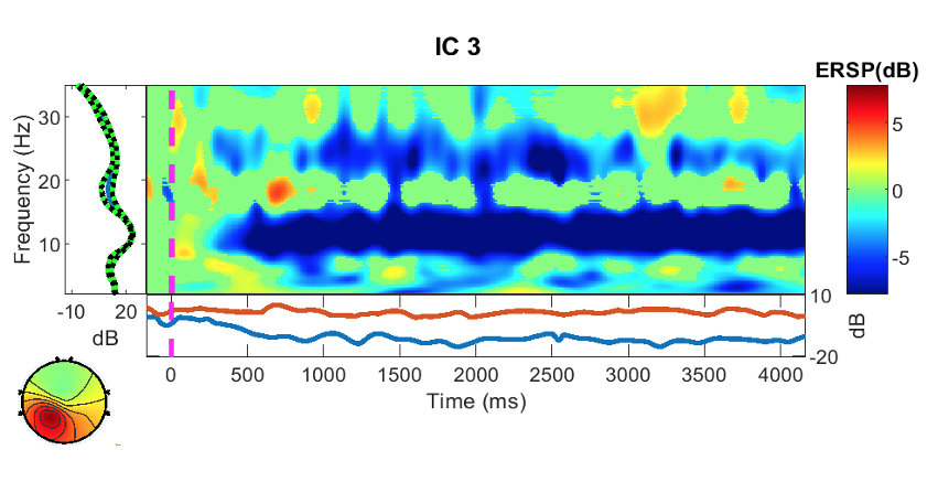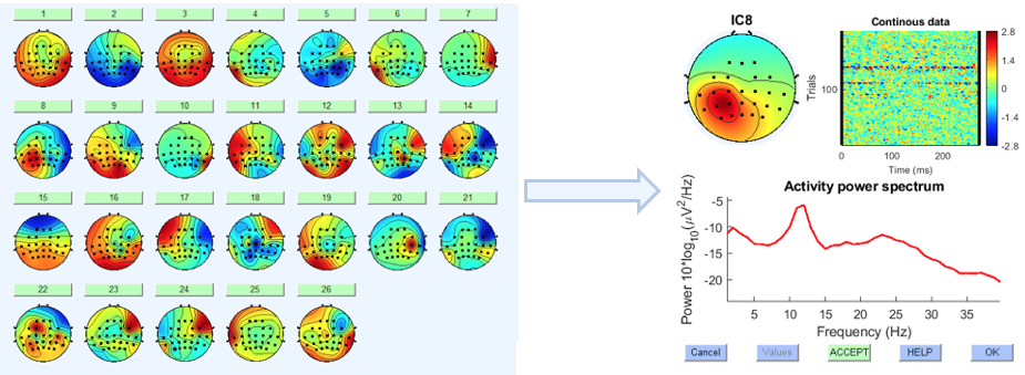 The following criteria were used to identify motor-related components following ICA: (1) the spatial pattern, indicating the component's source location, should match the scalp projection of the sensorimotor cortex on each hemisphere; and (2) the component's power spectrum density (PSD) should match the typical spectral profile of mu/beta rhythms. In practice, a motor component should satisfy both of these requirements. Earlier research established that the number of motor components differed between people.
